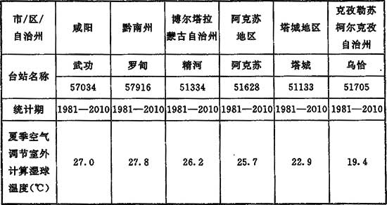 本附錄提供了我國除香港、澳門特別行政區(qū),臺灣外28個省級行政區(qū)、4個直轄市所屬294個臺站的室外空氣計算參數(shù)。由于臺站遷移、觀測條件不足等因素,個別臺站的基礎(chǔ)數(shù)據(jù)缺失,統(tǒng)計年限不足30年。統(tǒng)計年限不足30年的計算結(jié)果在使用時應(yīng)參照鄰近臺站數(shù)據(jù)進(jìn)行比較、修正。咸陽、黔南州及新疆塔城地區(qū)等個別臺站的濕球溫度無記錄,可參考表15的數(shù)值選取。