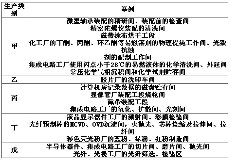 表B 潔凈廠房生產(chǎn)工作間的火災危險性分類舉例: