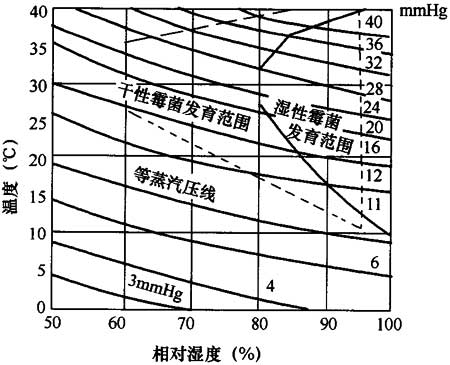 6.2.7、6.2.8 本節(jié)對圍護結(jié)構(gòu)內(nèi)表面抗菌涂飾工程進行了規(guī)定,由于在食品工業(yè)用房內(nèi)使用抗菌涂飾工程目前在國內(nèi)外意見不太統(tǒng)一,擔(dān)心抗菌產(chǎn)品會使食品中產(chǎn)生抗藥性菌株,但對于濕度經(jīng)常超過75%或有蒸汽作業(yè)的房間或關(guān)鍵區(qū)域的抗菌防霉問題,目前仍沒有更好的解決辦法,內(nèi)表面抗菌有很多方法,如消毒,但本規(guī)范僅對使用抗菌涂料的情況進行了規(guī)定。當(dāng)相對濕度達到80%時,不論溫度高低,基本上都要發(fā)霉,見圖4,所以此時可涂防霉涂料。